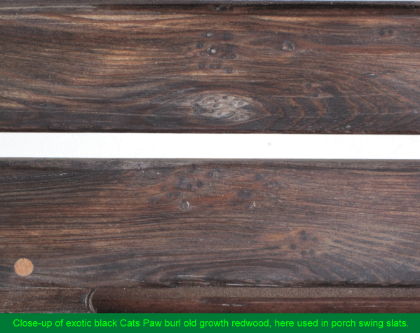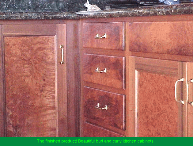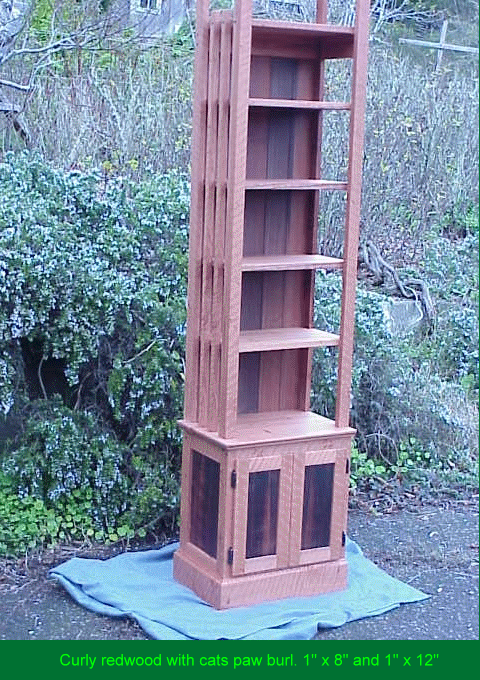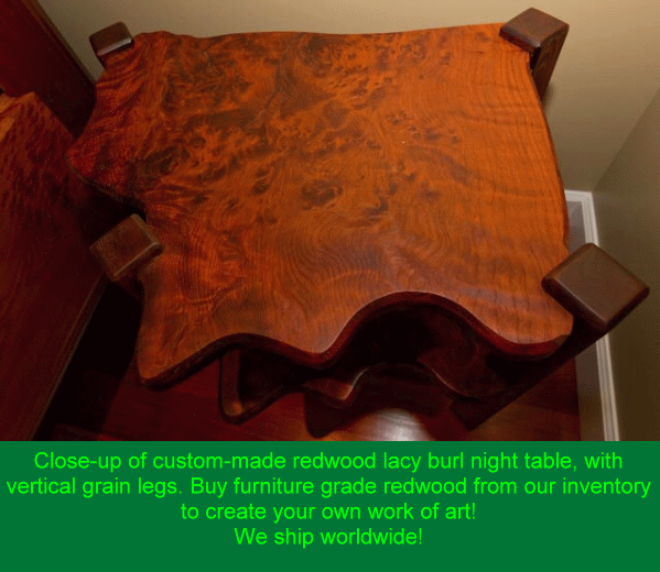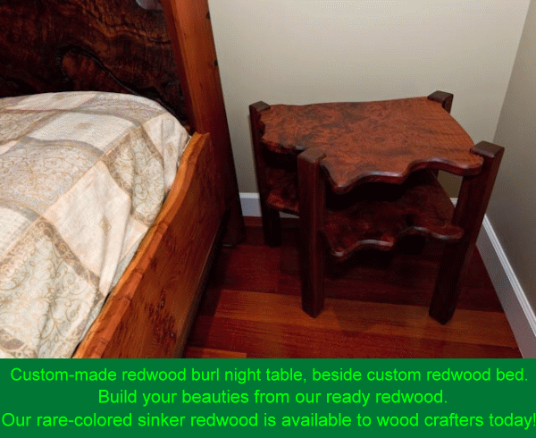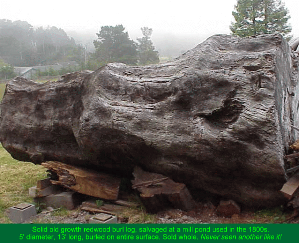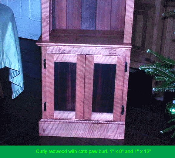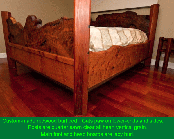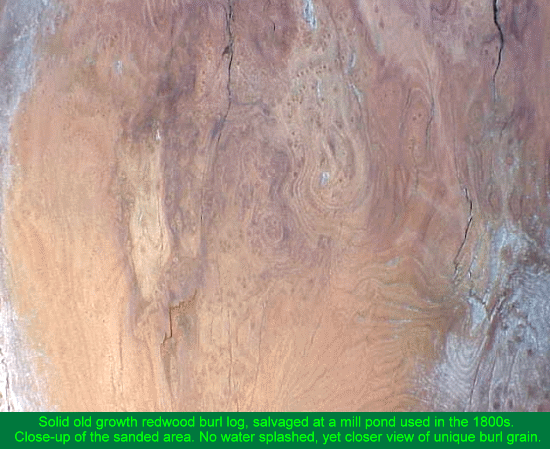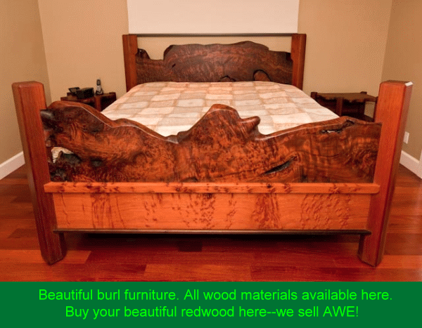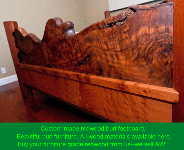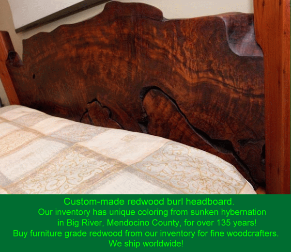 We have old-growth redwood burl and curly available in slabs and panels, custom-milled from 3″ x 24″ x 8′ and down. Colors are unique to sawlogs salvaged from ocean proximity rivers. Redwood burl and curly create a unique quality to this fine kitchen cabinetry.